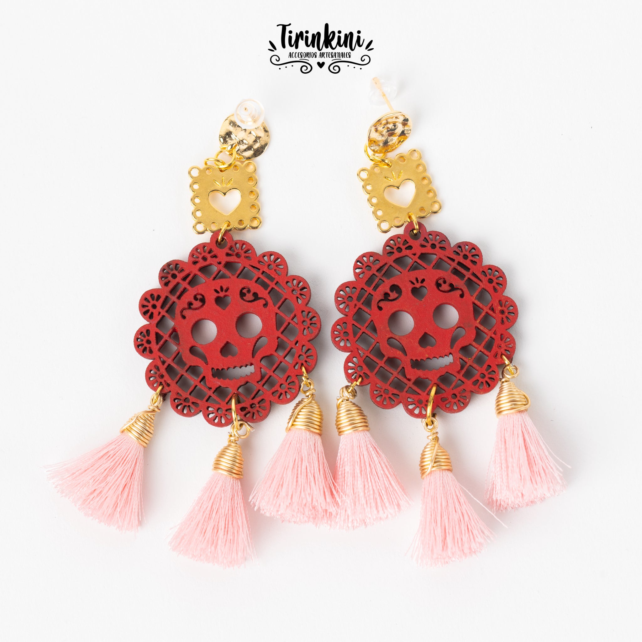 Aretes elaborados con mini papel picado en mdf pintados a mano, motitas de seda y detalles en chapa de oro.