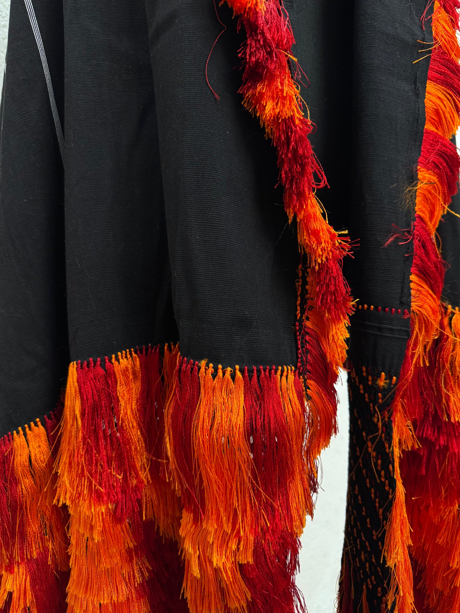 Rebozo elaborado en telar de cintura con algodón fino, rapacejo de articela